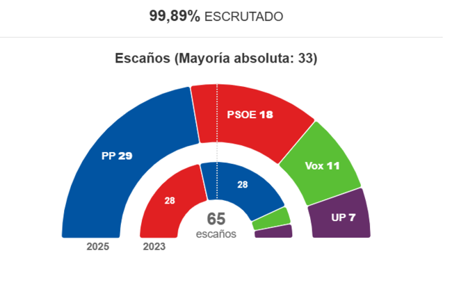 The PP obtained 43,2 % of votes (29 seats of the 65 totals, staying at 4 of the absolute majority). The PSOE collapsed until 25,7 % (18 seats), the far-right party Vox rose to 16,9 % (11 seats) at the expense of the votes that the PP lost, while the coalition of Unidas por Extremadura (We can–IU–AV) reached 10,3 % (7 seats) in the regional assembly.